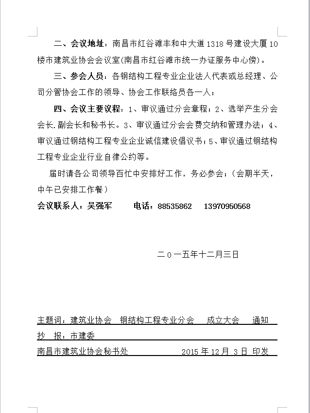 關(guān)于召開南昌市建筑業(yè)協(xié)會(huì)鋼結(jié)構(gòu)工程專業(yè)分會(huì)成立大會(huì)的通知